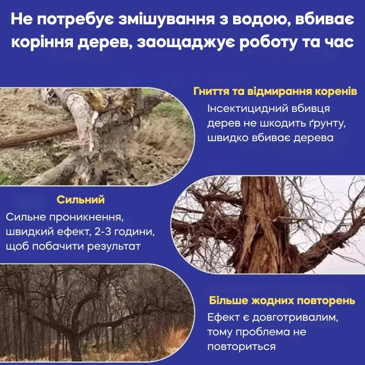 Гермес-100 — це не просто гербіцид. Це концентрований засіб, розроблений для повної та безповоротної ліквідації небажаної рослинності. Його унікальна формула проникає глибоко в структуру рослини через стовбур або стебло, досягаючи самого коріння, і повністю руйнує його зсередини. Це гарантує, що дерево, кущ чи бур’ян не просто засохне на поверхні, а буде ліквідоване назавжди, без шансів на повторний ріст. Більше не потрібно нічого пиляти, копати чи змішувати з водою — лише один крок до чистої ділянки.
