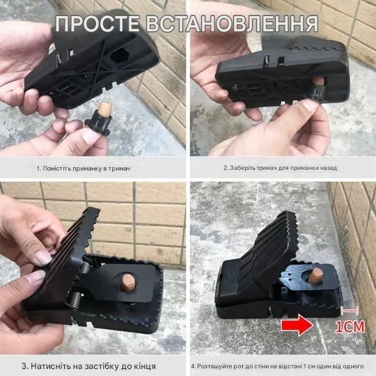 Легко встановити – наші пастки для щурів та мишей легко встановити. Покладіть ароматичну приманку в станцію для приманки, таку як сир, арахіс, бекон тощо. Розмістіть ці пастки для знищення мишей біля плінтусів, кутів або в просторах. Як тільки гризун спрацює пастку, високоточна пружина з нержавіючої сталі утримуватиме її на місці та забезпечуватиме бездоганне знищення щоразу.
